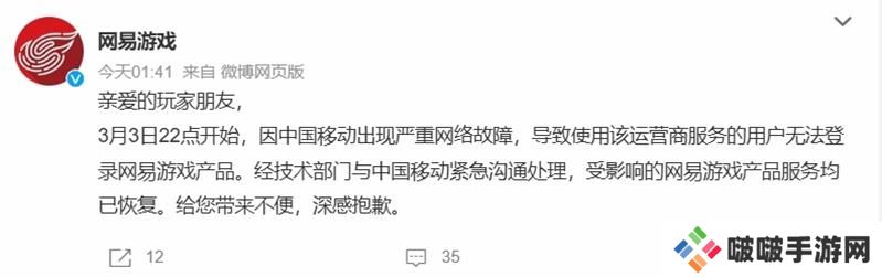 在公告中,官方表示,自3月3日22点开始,因中国移动出现严重网络故障,导致使用该运营商服务的用户无法登录网易游戏产品。经技术部门与中国移动紧急沟通处理,受影响的网易游戏产品服务均已恢复。给您带来不便,深感抱歉。