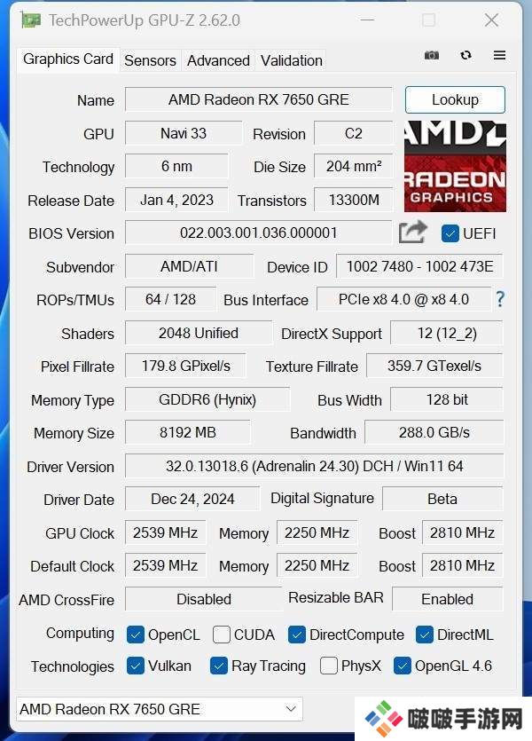 规格方面,蓝宝石RX 7650 GRE 8G D6黑钻版OC拥有2048个流处理器,采用RDNA3架构,Navi 33核心,配备8GB GDDR6显存,显存位宽为128bit,带宽为288GB/s。Boost频率为2810MHz,标频为2695MHz,更适合1080p分辨率下的游戏。